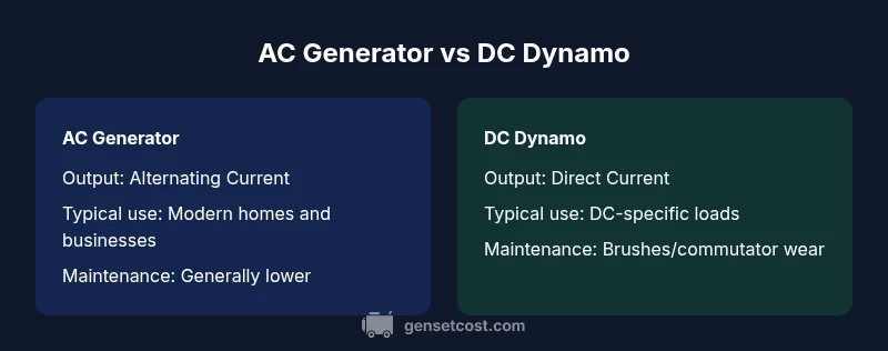 The key difference is output type and historical design: generators typically produce AC, while dynamos produce DC output using a commutator. Modern dynamos are rare in new builds, making AC generators the default for most homeowners.