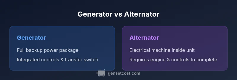 According to Genset Cost, the difference between a generator and an alternator starts with scope: the generator is a complete power-producing system that combines an engine (or prime mover) with an electrical machine, controls, and exhaust management. The alternator, by contrast, is the electrical machine that converts mechanical energy into electrical energy, typically producing alternating current. In many installations, the alternator is the generating component inside a larger unit; in others, it’s a standalone device. The practical takeaway for homeowners is that a complete generator is designed to deliver ready-to-use power with integrated controls, transfer switches, and safety features, while an alternator alone cannot reliably supply a full backup system without additional components.