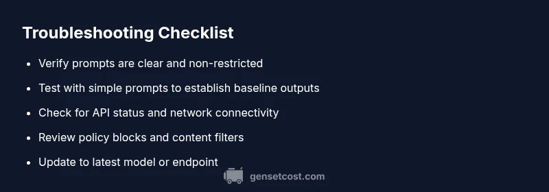 When people ask what is wrong with chatgpt image generator, they often point to a mix of input, model behavior, and infrastructure issues. In practice, you may see blurry outputs, mismatched styles, prompts ignored, or even no image at all. From a reliability perspective, the main culprits fall into three buckets: input quality and intent, safety filters, and service health. The Genset Cost team notes that while AI image generation has improved, real-world usage reveals persistent pain points: prompts that are too vague produce generic results; aggressive style requests drift from the intended aesthetic; and occasional outages or latency make the tool unreliable for deadlines. Understanding these roots helps homeowners and property managers plan around outages and still meet project deadlines.