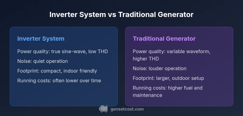 An inverter-based backup converts stored energy into clean AC power with low distortion and automatic transfer, while a traditional generator relies on fuel-driven engines that can produce noisier output and higher maintenance needs. Inverters generally offer better efficiency and protection for sensitive electronics.