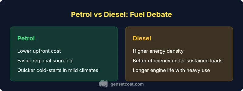 Do generators use petrol or diesel? The question matters for reliability and cost. According to Genset Cost, the petrol vs diesel decision affects fuel availability, maintenance, and total cost of ownership. Diesel engines excel for longer runtimes, while petrol units often have lower upfront costs. Use this guide to choose the fuel type that best fits your load and climate.