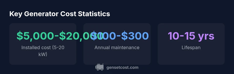 The term generator cost for home encompasses more than the sticker price of the unit itself. Homeowners often focus on the upfront price, but the total ownership cost includes installation, permits, transfer switches, wiring, and annual upkeep. In 2026, the Genset Cost Team emphasizes that the true cost also integrates fuel availability, labor rates in your market, and the reliability you demand during outages. When evaluating options, distinguish between standby generators (which power essential circuits automatically during an outage) and portable units (which typically require manual setup). Your goal is to balance reliability with overall cost of ownership, not just the lowest upfront price. Factors like your home’s square footage, the critical loads you want to sustain, and existing fuel lines influence both the upfront price and long-term expenses. For homeowners, the cost concept is best framed as total cost of ownership over the system’s lifespan, rather than a single purchase price.