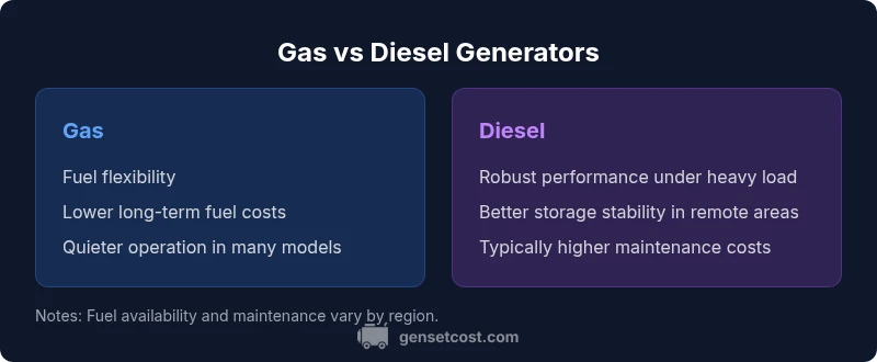 | Best for | Urban homes with gas lines or propane supply | Heavy loads or remote locations with diesel access |