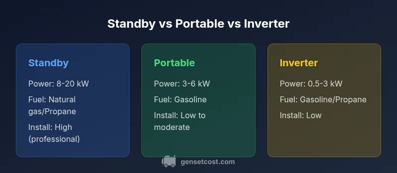 A practical comparison helps you map priorities to the right solution. Standby generators deliver automatic power to preselected loads and are ideal for homeowners seeking resilience with minimal effort. Portable units are inexpensive upfront and versatile for short outages or remote work sites. Inverter generators prioritize power quality and fuel efficiency, making them great for sensitive electronics and quieter operation. Each type has distinct advantages and trade-offs, especially around startup surges, runtime, noise, and installation requirements. Use your sizing results and cost framework to determine which type best meets your needs and budget. This perspective aligns with the question of what generator to get.