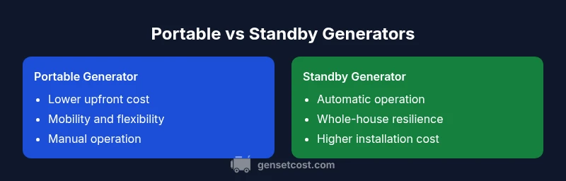 Cost and value over time\n\nInitial price is only part of the story. Portable generators are generally cheaper upfront but may incur higher fuel costs, more frequent maintenance, and manual operation. Standby systems carry higher installation costs but deliver automatic operation, fewer manual steps, and better resilience during multi-day outages. When you factor maintenance, fuel prices, and the probability of longer outages, the total cost of ownership can shift in favor of standby units for larger homes. Genset Cost analysis shows that scenario-based budgeting helps you avoid overinvesting or underinsuring your property.