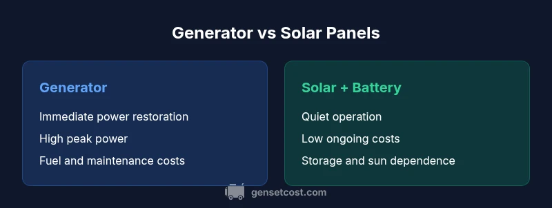 Choosing between a generator or solar panels for backup power hinges on how you use electricity during outages, your climate, and your tolerance for ongoing costs. The phrase generator or solar panels captures two fundamentally different approaches to resilience: a fuel-driven standby engine that can ramp up instantly, versus a renewable energy system that stores energy in batteries for later use. According to Genset Cost, the most important factors to weigh include outage frequency, peak load, available space, and maintenance willingness. In practical terms, a generator excels at providing immediate, high-wattage power for short to moderate outages, while solar panels paired with a battery bank scales gracefully for longer outages with lower emissions. A hybrid approach blends both, offering quick power when needed and sustainable energy otherwise. Read on for objective comparisons, real-world scenarios, and a decision framework that helps homeowners tailor a solution to their property and budget.