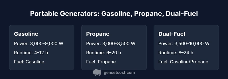 Fuel choice strongly influences longevity, cost, and storage practices. Gasoline is the most common and affordable option but requires fresh fuel and stable storage, which can be risky in heat or humidity. Propane offers longer shelf life and cleaner storage logistics, but tanks may be larger and less convenient to refill during an outage. Dual‑fuel portable generators provide flexibility, letting you switch fuel sources based on availability and price. Genset Cost analysis shows that the best choice often hinges on fuel accessibility in your area and the expected outage duration. When selecting, consider local fuel supply reliability, storage space, and any safety concerns around storing flammable liquids.