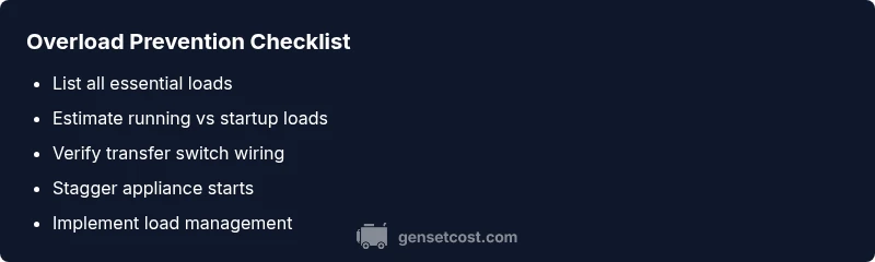 A generator shows overload when the current load exceeds its rated output or a fault triggers the safety limiter. Start by reducing continuous load, verify surge-capable devices, and ensure the transfer switch and wiring are correct. If the warning persists, consult the manual or a qualified technician. Overloads can occur during startup and with new loads pushing past continuous rating.