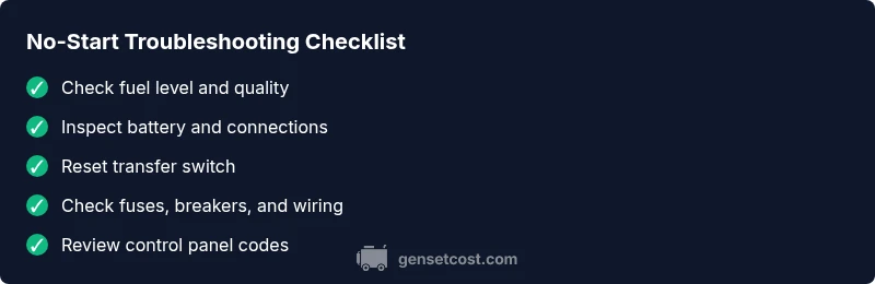 Why would a generator not start? In most cases the culprit is a simple one: fuel, battery, or the transfer switch. Quick fixes include verifying fresh fuel and proper fuel valves, ensuring the battery is charged with clean terminals, and resetting the transfer switch. If the generator still won't start or you see fault codes on the control panel, consult the manual or contact a qualified technician.