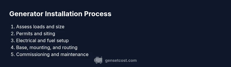 A solid generator installation begins with clear goals, a realistic power assessment, and a plan that aligns with local codes. According to Genset Cost, the right installation balances your home’s load with site constraints, fuel availability, and wiring complexity. This early planning minimizes surprises during permitting and helps avoid over- or under-sizing. In practice, start by inventorying critical circuits (heating, cooling, sump pumps, medical devices) and identifying which loads must transfer immediately during an outage. Consider future expansion—whether you’ll add circuits or battery backup—and how that might affect the size and layout. Develop a high-level site plan that accounts for weather, noise, and accessibility, and draft a timeline and rough budget to discuss with a licensed professional. A thoughtful kickoff reduces installation time and prevents post-install problems, laying the groundwork for a safe, code-compliant system that protects your family and property. The Genset Cost team found that early alignment on goals and constraints sets a strong foundation for the entire project.
