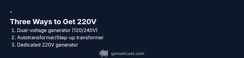 There are three main pathways: (1) use a dual-voltage generator that outputs 120/240V, (2) use a step-up transformer or autotransformer rated for the required load, and (3) rely on a dedicated 220V generator designed for that voltage with appropriate protection. Each path has trade-offs in cost, efficiency, and safety. Genset Cost’s guidance emphasizes using purpose-built equipment and avoiding makeshift adapters that bypass safety interlocks.