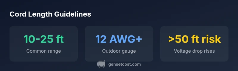 In most home backup setups, a generator cord length of 10 to 25 feet is common; shorter runs reduce voltage drop and improve safety. Always use outdoor-rated, heavy-gauge cords (at least 12 AWG) and never run a generator indoors or in an enclosed space. For longer runs, consider dedicated wiring or a transfer switch to maintain safety and reliability. how long generator cord